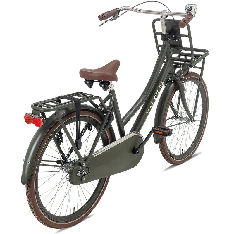 Le vélo de ville Valetta Cargo avec porte-bagages avant pratique est le vélo parfait pour les enfants scolarisés. Design intemporel, cadre robuste, selle confortable et éclairage LED lumineux.